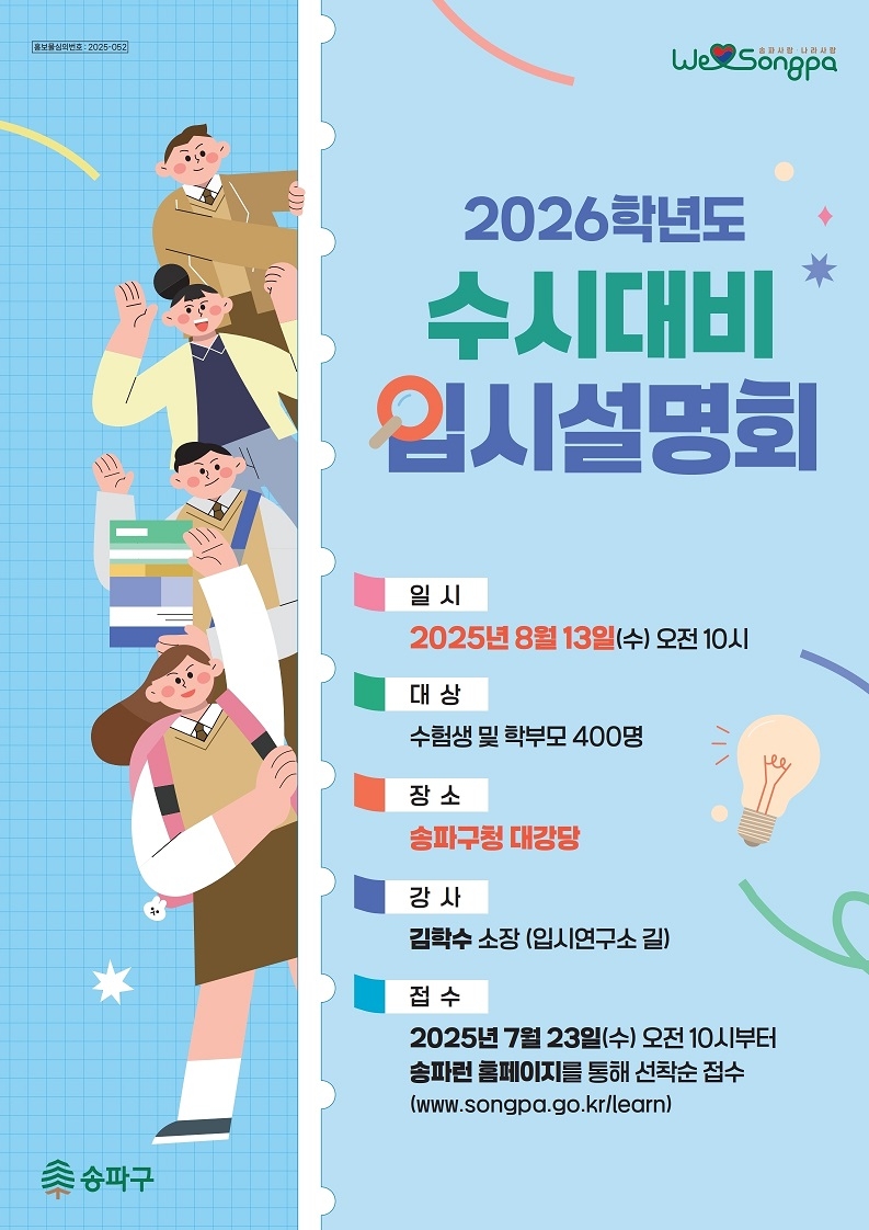 (서울=연합뉴스) 정준영 기자 = 서울 송파구(구청장 서강석)는 오는 8월 13일 구청 대강당에서 '2026학년도 수시 대비 입시설명회'를 개최한다고 28일 밝혔다.