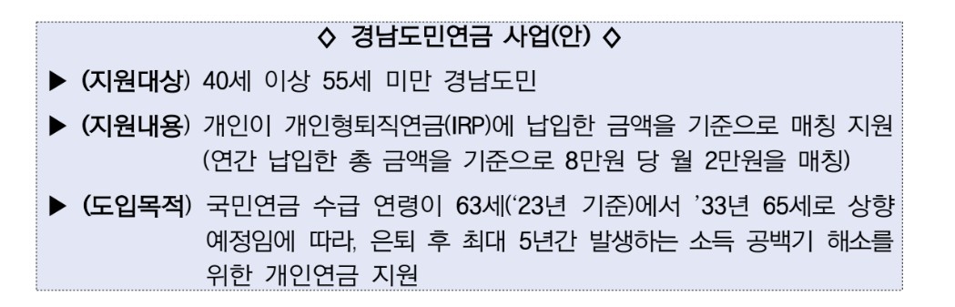 40세 이상 55세 미만 경남도민을 대상으로 개인형 퇴직연금(IRP) 연간 납입 총금액 8만원당 월 2만원을 매칭해 지원하는 방식이 검토되고 있다. 내년 중 도입하는 것이 목표다.