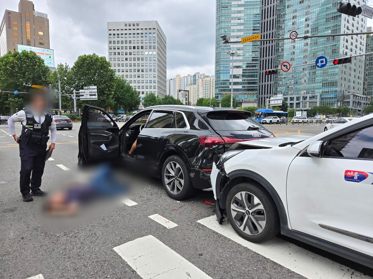 (서울=연합뉴스) 최원정 기자 = 4일 오전 11시 44분께 서울 마포구 공덕역 인근 도로에서 70대 남성이 몰던 택시가 횡단보도 앞에 서 있던 승용차를 들이받았다.