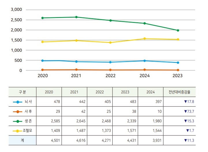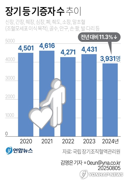 5일 국립 장기조직혈액관리원이 최근 펴낸 '2024년도 장기 등 기증 및 이식 통계 연보'에 따르면 지난해 장기 등을 기증한 사람은 3천931명으로 전년 대비 11.3% 감소했다.