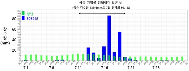상순과 하순 강수량이 각각 3.9㎜와 6.1㎜로 각각 7월 상순과 하순 기준 하위 1위와 하위 3위로 매우 적었으나 중순에 평년 강수량(106.5㎜)의 2배가 넘는 239.4㎜의 비가 내렸다. 지난달 중순 강수량은 7월 중순 기준 역대 4번째로 많았다.