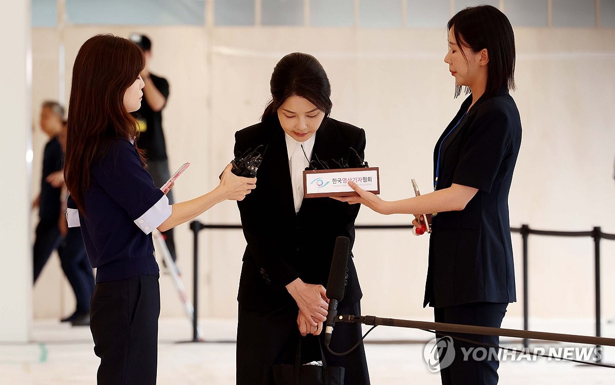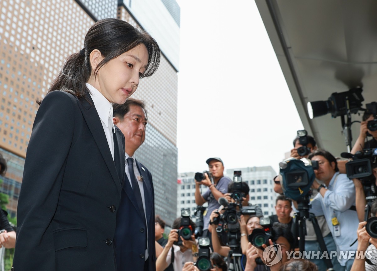(서울=연합뉴스) 윤석열 전 대통령 부인 김건희 여사가 6일 서울 종로구 민중기 김건희 특별검사팀 사무실에 자본시장법 위반 등 혐의 피의자 신분으로 출석하고 있다. 2025.8.6 [사진공동취재단] photo@yna.co.kr