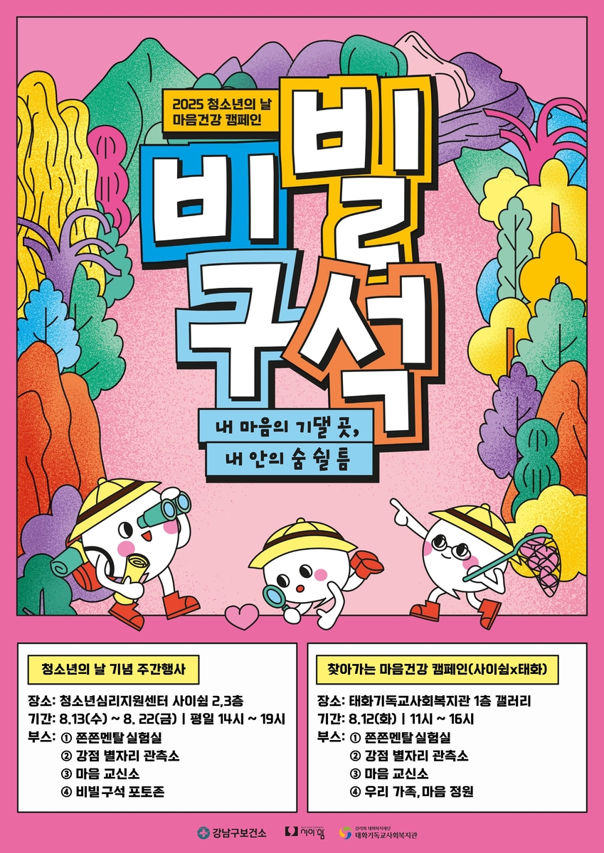 (서울=연합뉴스) 정준영 기자 = 강남구(구청장 조성명)는 국제 청소년의 날(8월 12일)을 기념해 오는 12~22일 '비빌 구석'을 주제로 청소년 마음건강 주간을 운영한다고 7일 밝혔다.