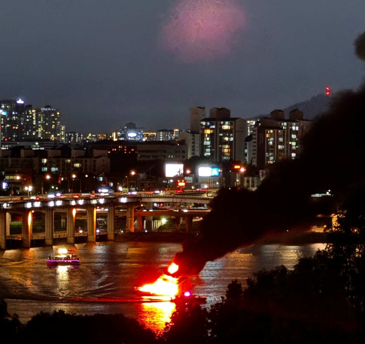 (서울=연합뉴스) 정윤주 기자 = 8일 오후 8시 45분께 서울 반포대교 인근 한강에 떠 있는 요트에서 불이 나 탑승객들이 대피했다.
