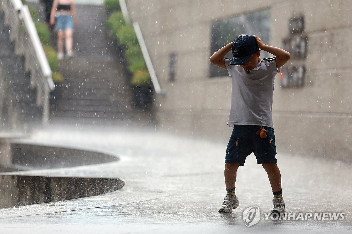 (서울=연합뉴스) 신현우 기자 = 8일 서울 청계천에서 외국인 어린이가 비를 맞으며 춤을 추고 있다. 2025.8.8 nowwego@yna.co.kr