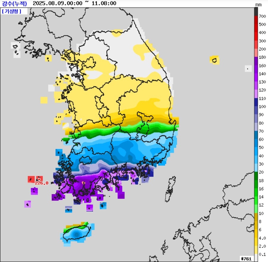 9일부터 11일 오전 8시까지 누적 강수량 분포. [기상청 제공. 재판매 및 DB 금지]