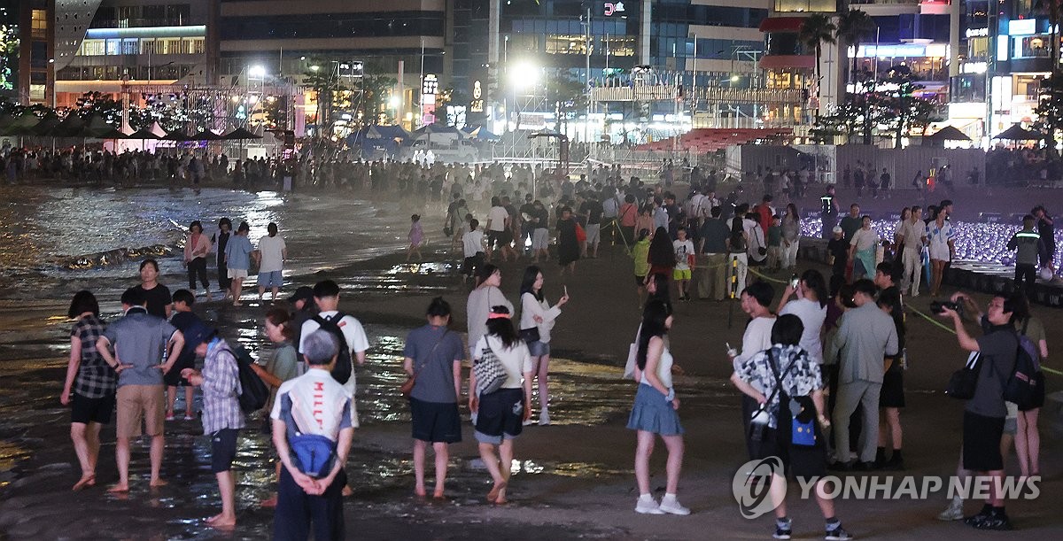 (부산=연합뉴스) 강선배 기자 = 후텁지근한 더위가 이어진 10일 밤 부산 수영구 광안리해수욕장에서 드론쇼를 관람한 시민과 관광객들이 더위를 식히고 있다. 2025.8.10 sbkang@yna.co.kr