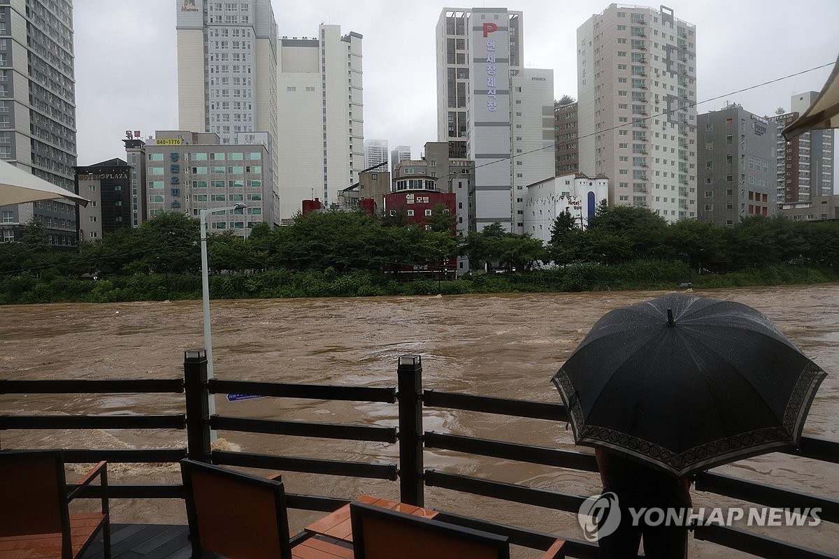 (의정부=연합뉴스) 임병식 기자 = 수도권에 집중호우가 쏟아진 13일 경기도 의정부시 중랑천에서 물이 불어나 있다. 2025.8.13 andphotodo@yna.co.kr