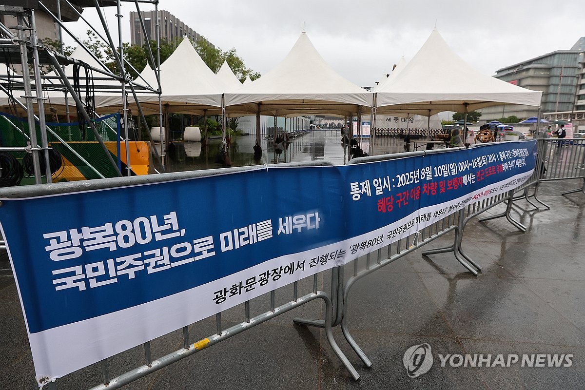 (서울=연합뉴스) 서대연 기자 = 광복절을 이틀 앞둔 13일 서울 종로구 광화문광장 일대가 '광복 80주년, 국민주권으로 미래를 세우다' 행사 준비 등으로 통제되고 있다. 2025.8.13 dwise@yna.co.kr