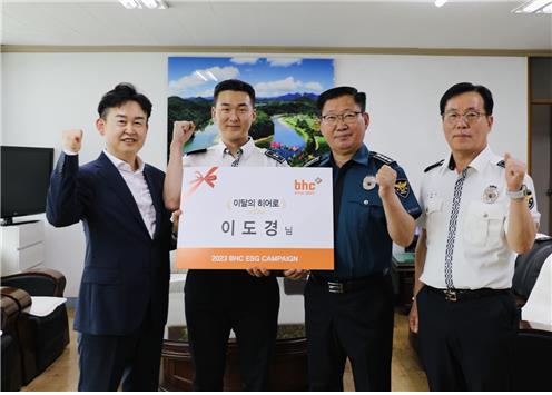 왼쪽부터 이재이 bhc그룹 이사, 이도경 순경, 정대이 영월경찰서장, 엄대식 경감. [bhc그룹 제공. 재판매 및 DB금지]