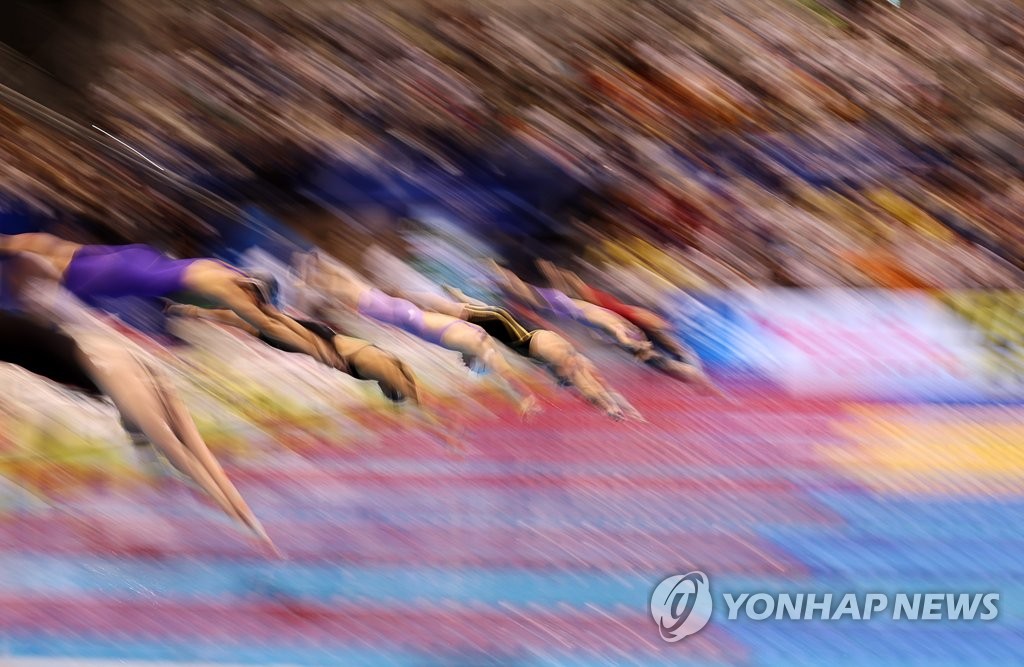 (후쿠오카=연합뉴스) 윤동진 기자 = 28일 일본 후쿠오카 마린 메세 후쿠오카홀에서 열린 2023 세계수영선수권 여자 접영 50m 예선 경기에서 선수들이 출발하고 있다. 2023.7.28 mon@yna.co.kr