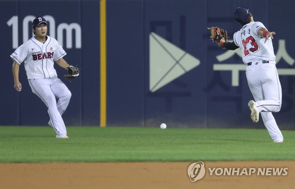 (서울=연합뉴스) 이지은 기자 = 17일 오후 서울 잠실야구장에서 열린 프로야구 kt와 두산의 경기. 5회초 두산 강승호가 kt 배정대의 타구를 잡지 못하고 있다. 결과는 안타. 2023.8.17 jieunlee@yna.co.kr