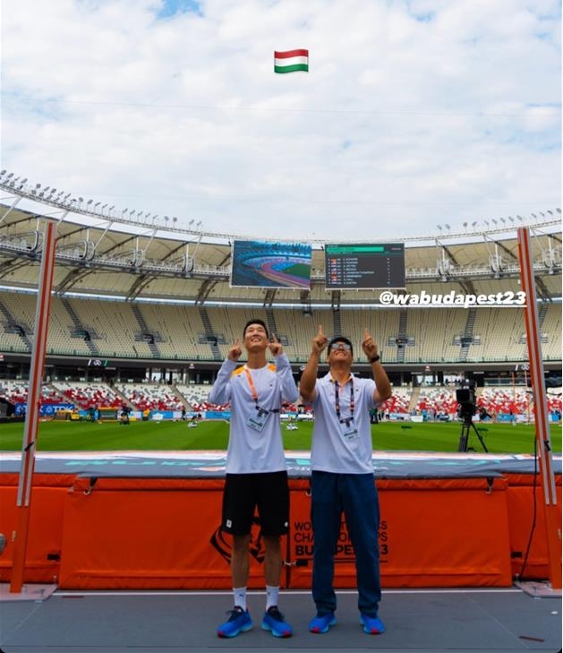 철저한 준비와 자신감으로 무장한 '스마일 점퍼' 우상혁은 19일 부다페스트 국립육상경기장에서 김도균 코치와 함께 밝은 표정으로 '기념 촬영'을 했다.