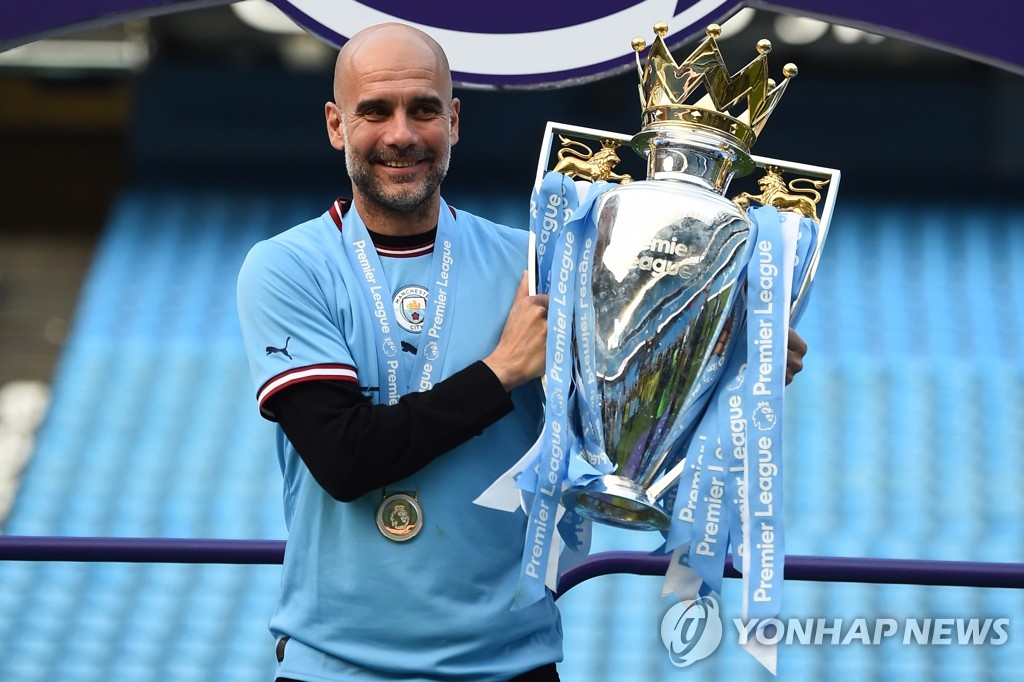(맨체스터 EPA=연합뉴스) 페프 과르디올라(52·스페인) 맨체스터 시티 감독이 21일(현지시간) 영국 맨체스터의 에티하드 스타디움에서 열린 첼시와 2022-2023 프리미어리그(EPL) 37라운드 경기가 끝나고 우승 트로피를 들고 포즈를 취하고 있다. 이번 우승으로 과르디올라 감독과 맨시티 선수단은 정규리그 3연패를 달성했다. 2023.05.22 jason3669@yna.co.kr