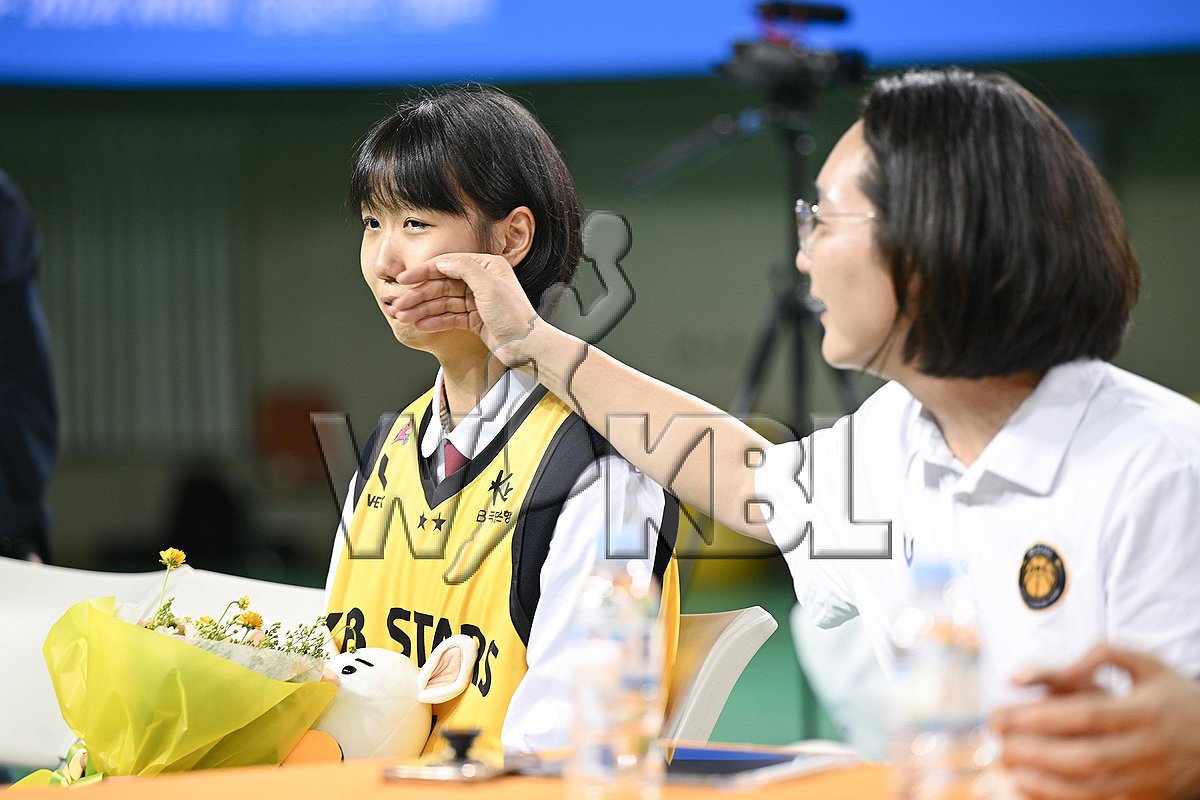 (청주=연합뉴스) 전 여자농구 국가대표 조문주의 딸인 수피아여고 포워드 고현지(18·182.2㎝)가 4일 충북 청주체육관에서 열린 한국여자농구연맹(WKBL) 2023-2024 신입 선수 선발회에서 전체 1순위로 KB에 지명됐다. 사진은 울먹이는 고현지. 2023.9.4 [WKBL 제공. 재판매 및 DB 금지] photo@yna.co.kr