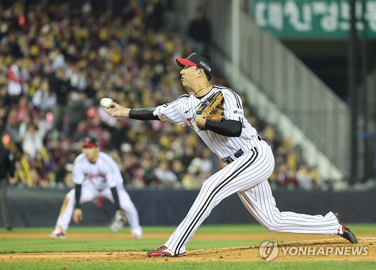 (서울=연합뉴스) 임화영 기자 = 8일 서울 잠실야구장에서 열린 2023 KBO 한국시리즈 2차전 kt wiz와 LG 트윈스의 경기. 3회초 LG 투수 정우영이 역투하고 있다. 2023.11.8 hwayoung7@yna.co.kr