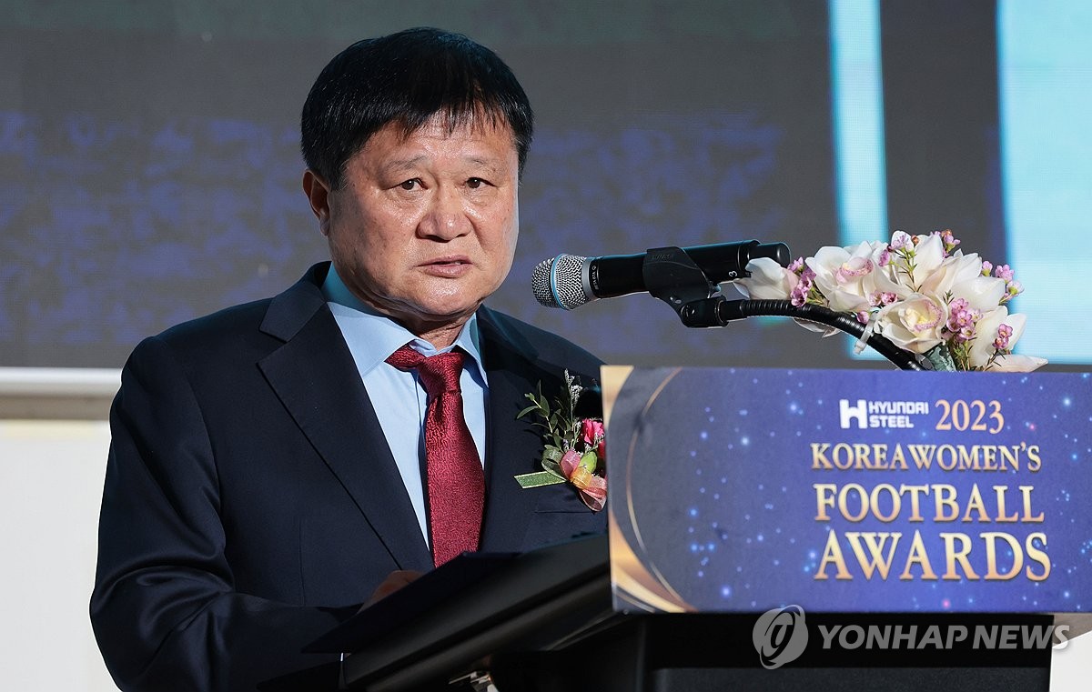 (서울=연합뉴스) 김인철 기자 = 14일 오후 서울 송파구 올림픽파크텔에서 열린 2023 여자축구 WK리그 시상식에서 오규상 한국여자축구연맹 회장이 환영사를 하고 있다. 2023.12.14 yatoya@yna.co.kr