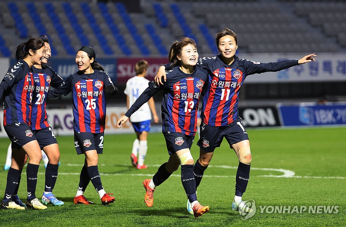 (수원=연합뉴스) 홍기원 기자 = 5일 경기도 수원종합운동장에서 열린 WK리그 2024 챔피언결정전 1차전 수원FC 위민과 화천 KSPO의 경기. 골을 넣은 수원FC 강채림이 동료들과 기뻐하고 있다. 2024.11.5 xanadu@yna.co.kr