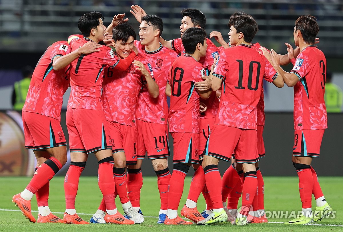 (쿠웨이트시티=연합뉴스) 황광모 기자 = 14일 오후(현지시간) 쿠웨이트 자베르 알 아흐메드 국제 경기장에서 열린 2026 북중미 월드컵 아시아지역 3차 예선 B조 5차전 한국과 쿠웨이트의 경기. 대한민국 오세훈이 첫 골을 넣자 선수들이 서로를 격려하고 있다. 2024.11.14 hkmpooh@yna.co.kr