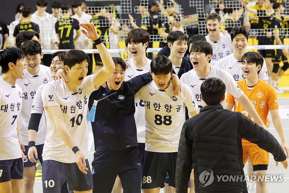 (의정부=연합뉴스) 김병만 기자 = 30일 경기도 의정부 경민대체육관에서 열린 도드람 2024-2025 V리그 남자부 플레이오프 3차전 KB손해보험-대한항공 경기. 대한항공 선수들이 승리한 후 기뻐하고 있다. 2025.3.30 kimb01@yna.co.kr