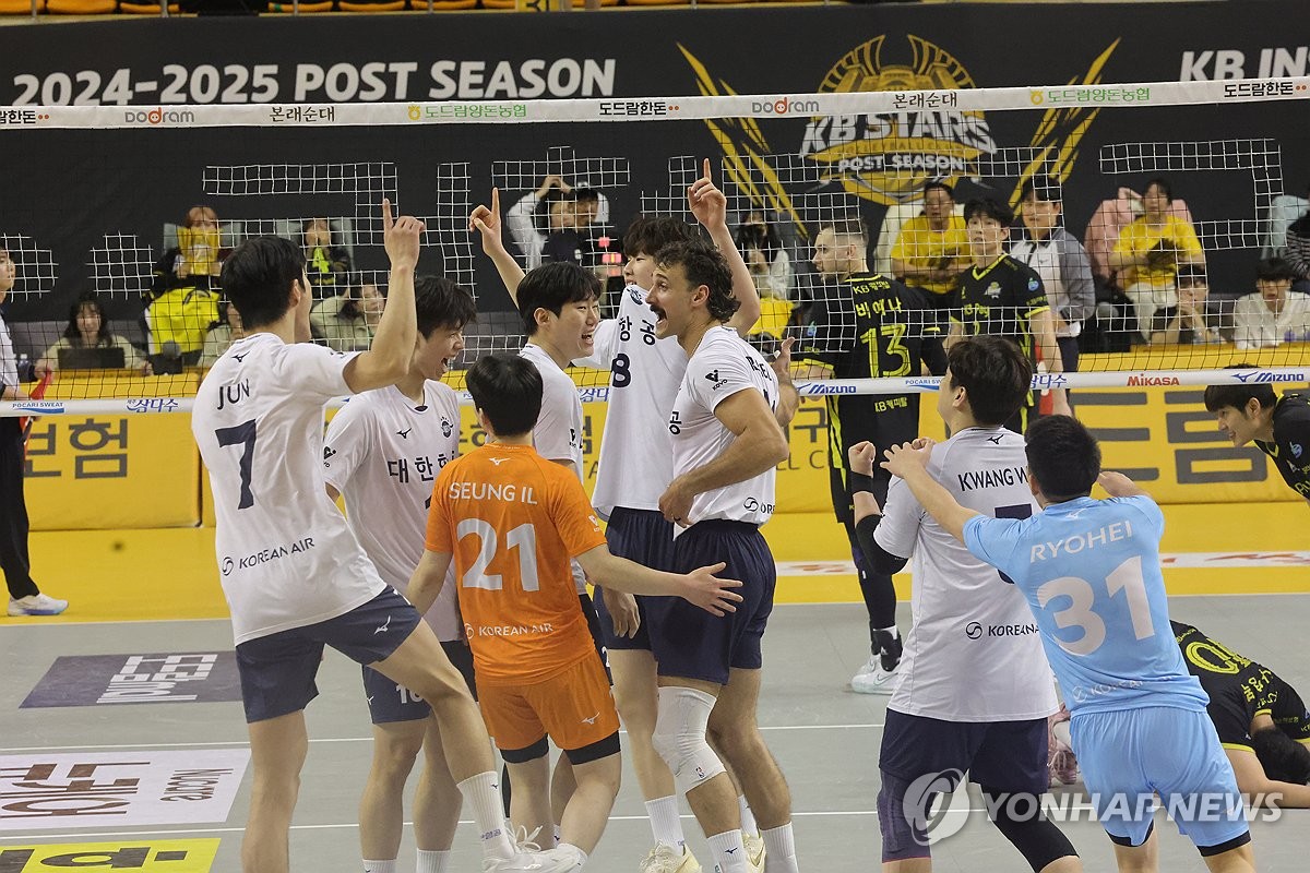 (의정부=연합뉴스) 김병만 기자 = 30일 경기도 의정부 경민대체육관에서 열린 도드람 2024-2025 V리그 남자부 플레이오프 3차전 KB손해보험-대한항공 경기. 대한항공 선수들이 승리한 후 기뻐하고 있다. 2025.3.30 kimb01@yna.co.kr