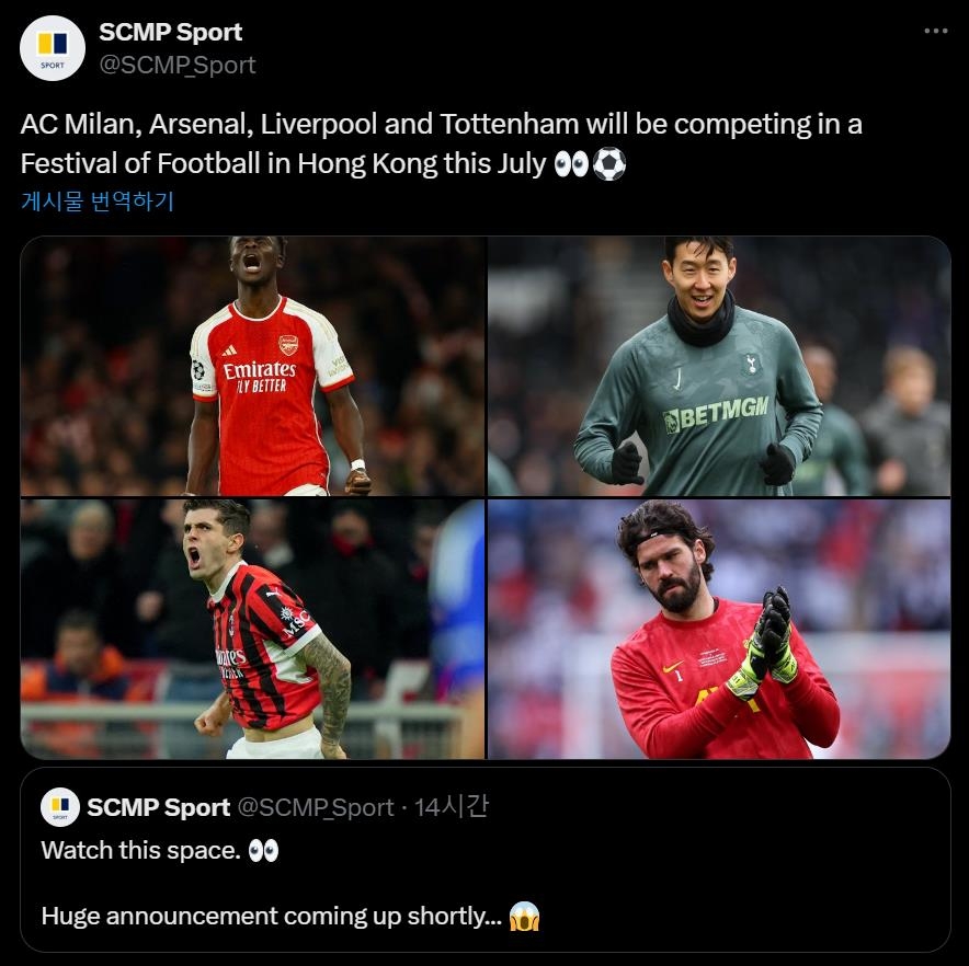 홍콩 사우스차이나 모닝포스트에 따르면 '2025 홍콩 풋볼 페스티벌'에는 토트넘과 아스널을 비롯해 리버풀(잉글랜드)과 AC밀란(이탈리아)도 참가한다.