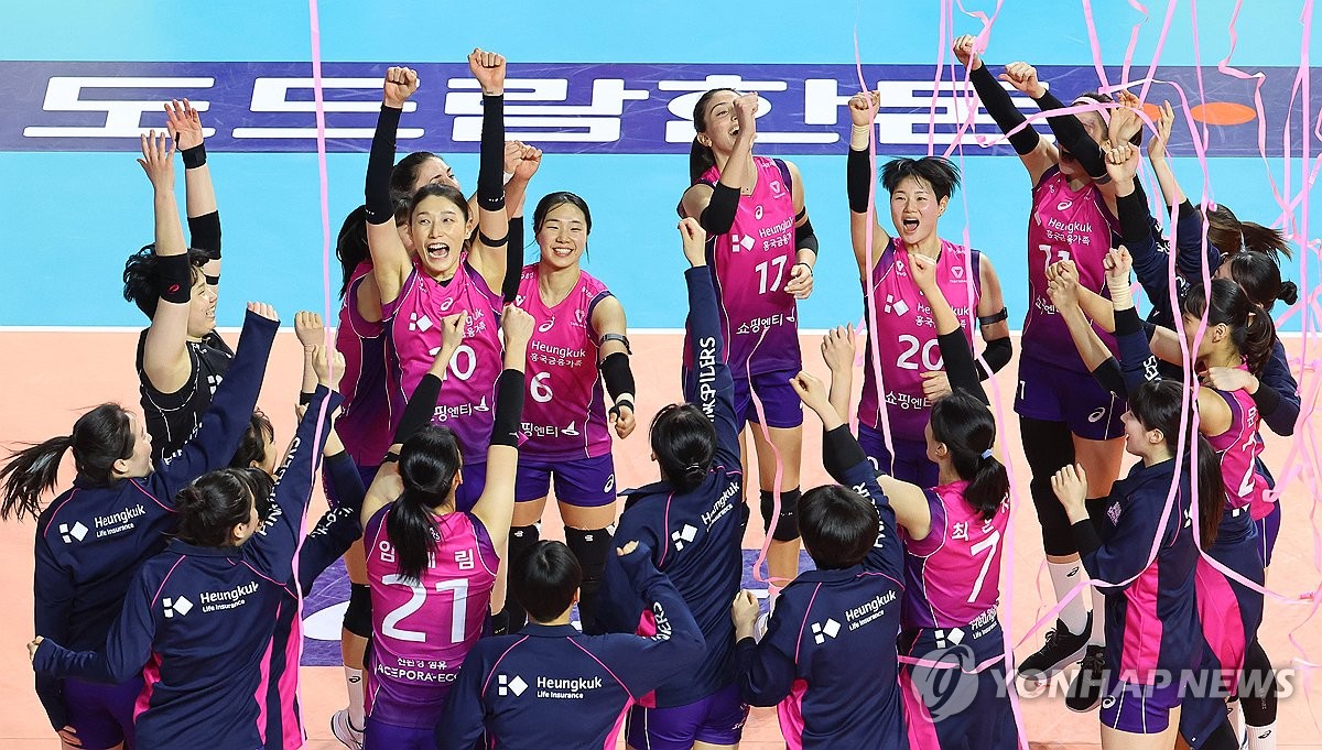 (인천=연합뉴스) 임순석 기자 = 31일 인천 삼산월드체육관에서 열린 프로배구 V리그 여자부 챔피언결정전 흥국생명과 정관장의 1차전 경기. 세트스코어 3-0으로 승리한 흥국생명 선수들이 기뻐하고 있다. 2025.3.31 soonseok02@yna.co.kr