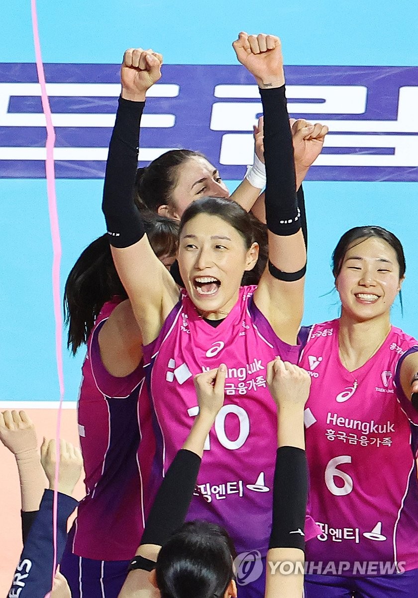(인천=연합뉴스) 임순석 기자 = 31일 인천 삼산월드체육관에서 열린 프로배구 V리그 여자부 챔피언결정전 흥국생명과 정관장의 1차전 경기. 세트스코어 3-0으로 흥국생명이 승리하자 김연경이 동료들과 기뻐하고 있다. 2025.3.31 soonseok02@yna.co.kr