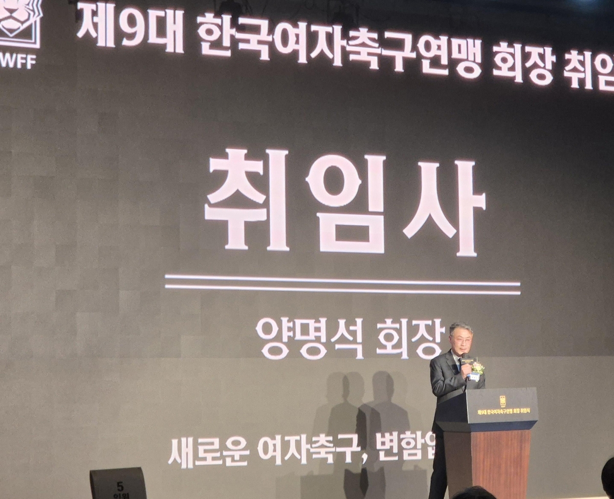 (서울=연합뉴스) 이의진 기자 = 양명석 한국여자축구연맹 회장이 변화와 발전을 약속하며 취임했다.
