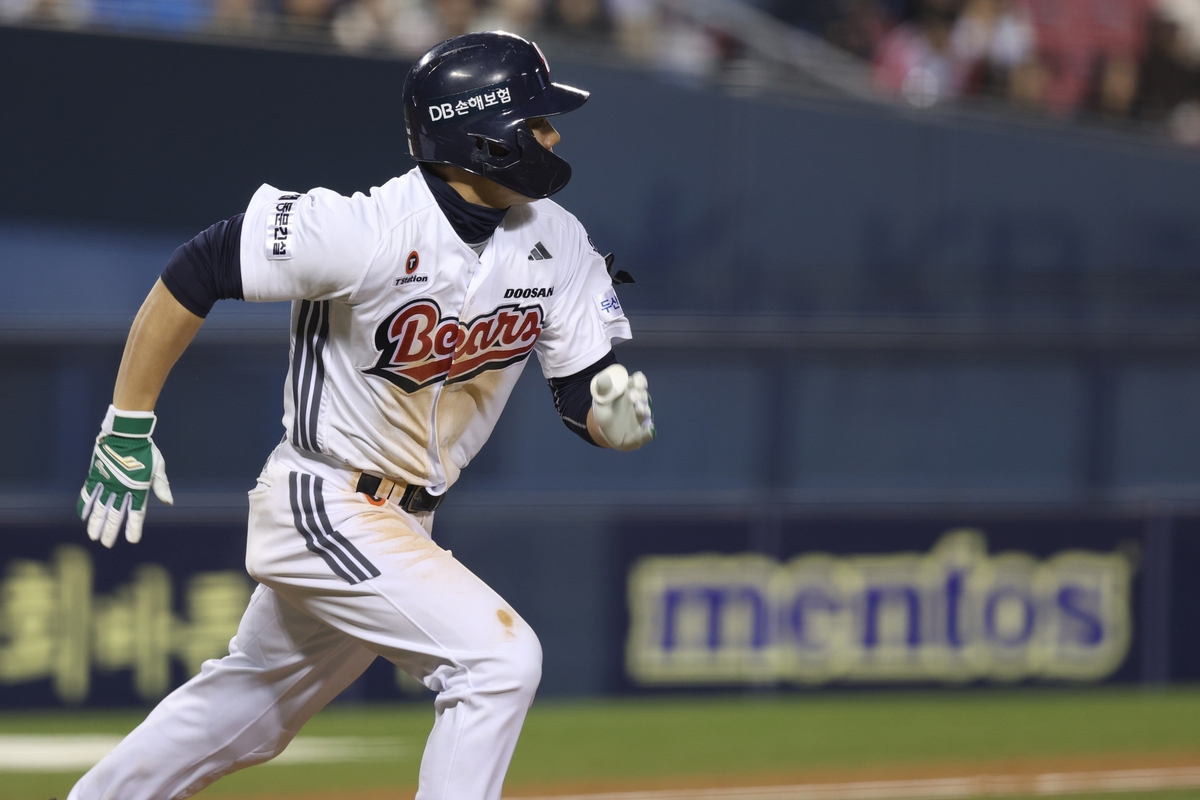 (서울=연합뉴스) 두산 오명진이 2일 서울 잠실구장에서 열린 프로야구 키움과의 홈 경기, 4회말 중전 안타를 친 뒤 1루로 달리고 있다. 오명진의 1군 무대 첫 안타다. [두산 베어스 제공. 재판매 및 DB금지]
