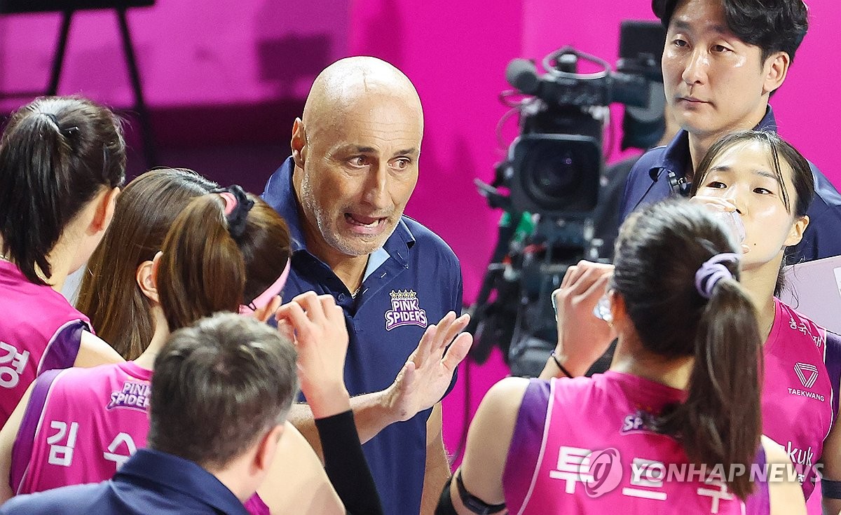 (인천=연합뉴스) 임순석 기자 = 2일 인천 삼산월드체육관에서 열린 프로배구 V리그 여자부 챔피언결정전 흥국생명과 정관장의 2차전 경기. 흥국생명 아본단자 감독이 작전을 지시하고 있다. 2025.4.2 soonseok02@yna.co.kr