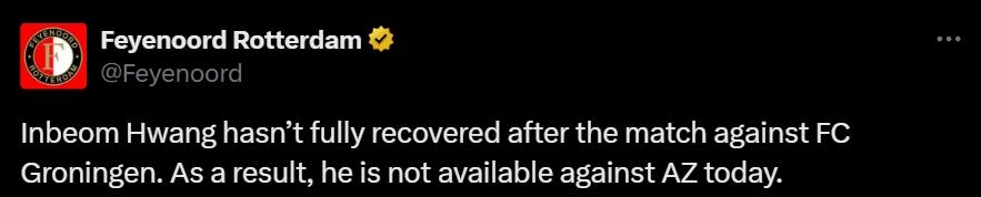 킥오프에 앞서 페예노르트는 사회관계망서비스(SNS) X 계정에 "황인범이 흐로닝언전 이후 완전히 회복되지 않아 알크마르전에 출전할 수 없다"라며 황인범의 결장을 공지했다.
