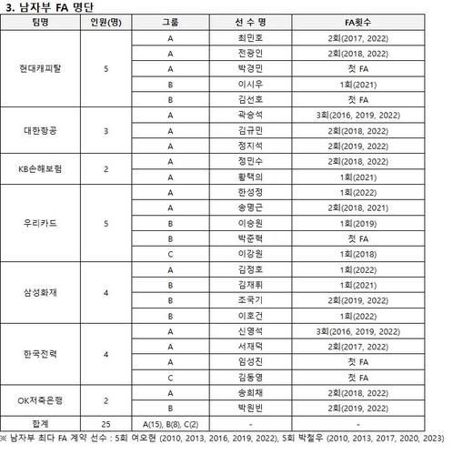 한국배구연맹(KOVO)이 8일 FA 자격을 얻은 25명의 선수 명단을 공시함에 따라 오는 21일까지 2주간의 협상 기간이 시작됐다.