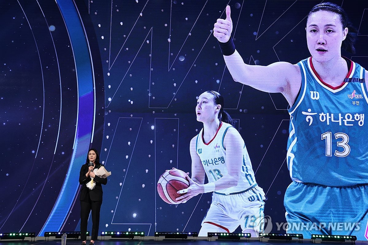 (서울=연합뉴스) 윤동진 기자 = 하나은행 김정은이 24일 용산구 서울드래곤시티에서 열린 하나은행 2024-2025 여자프로농구 정규리그 시상식에서 특별상을 수상 후 소감을 밝히고 있다. 2025.2.24 mon@yna.co.kr