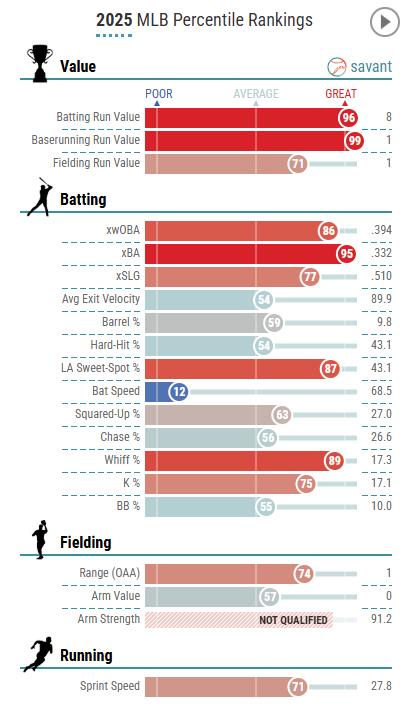 타구의 질을 기반으로 한 정교한 지표인 예상 가중 출루율(xwOBA)은 0.394로 리그 상위 14%, 예상 타율(xBA)은 0.332로 리그 상위 5%다.