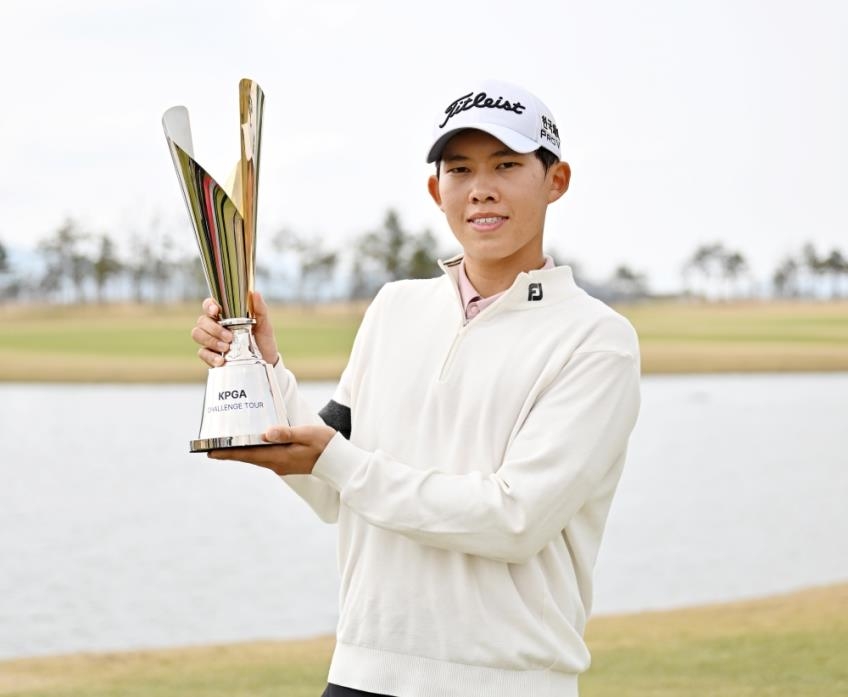차우진이 18일 전남 해남군 솔라시도컨트리클럽(파72·7천61야드)에서 열린 한국프로골프(KPGA) 챌린지투어 5회 대회에서 우승한 뒤 트로피를 들고 포즈를 취하고 있다. [한국프로골프협회 제공. 재배포 및 DB 금지]