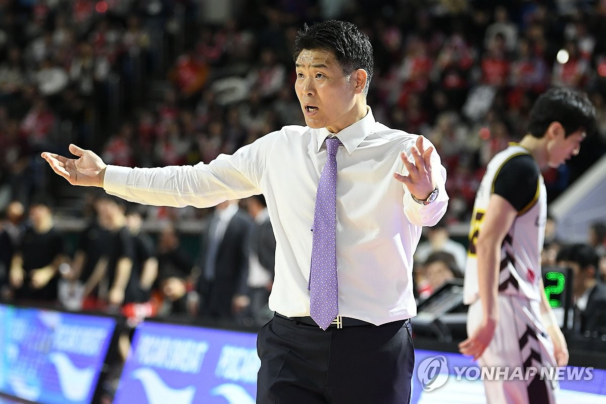 (안양=연합뉴스) 서명곤 기자 = 17일 경기 안양정관장아레나에서 열린 2024-2025 KCC 프로농구 6강 PO 3차전 안양 정관장과 울산 현대모비스의 경기. 울산모비스 조동현 감독이 주먹을 쥐고 있다. 2025.4.17 seephoto@yna.co.kr