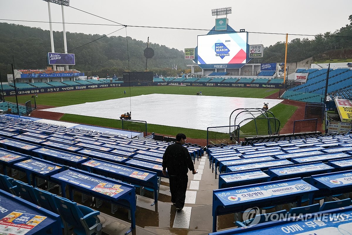 (대구=연합뉴스) 윤동진 기자 = 14일 대구삼성라이온즈파크에서 열릴 예정이던 2024 KBO 포스트시즌 플레이오프 2차전 LG 트윈스 대 삼성 라이온즈 경기가 비로 취소됐다.