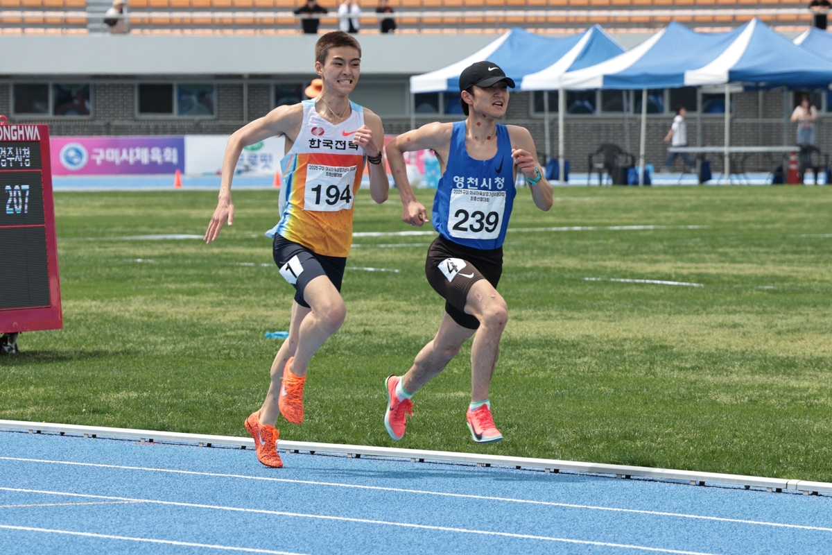 (서울=연합뉴스) 박재우(오른쪽)가 23일 경북 구미시민운동장에서 열린 2025 구미 아시아육상선수권 최종 선발대회 남자 5,000m에서 역주하고 있다. [대한육상연맹 제공. 재판매 및 DB금지]