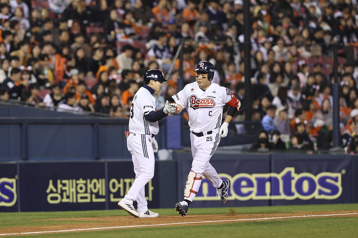 (서울=연합뉴스) 8일 서울 송파구 잠실야구장에서 열린 2025 KBO리그 프로야구 한화 이글스와 두산 베어스의 경기. 홈런을 친 양의지가 하이파이브를 하고 있다. 2025.4.8 [두산 베어스 제공. 재판매 및 DB 금지] photo@yna.co.kr