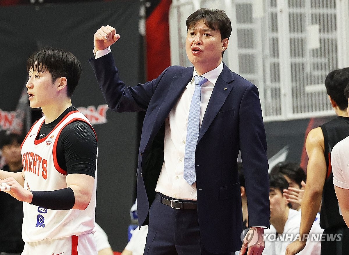 (수원=연합뉴스) 홍기원 기자 = 29일 경기도 수원KT소닉붐아레나에서 열린 프로농구 4강 플레이오프 4차전 수원 KT 소닉붐과 서울 SK 나이츠의 경기. KT 송영진 감독이 작전을 지시하고 있다. 2025.4.29 xanadu@yna.co.kr