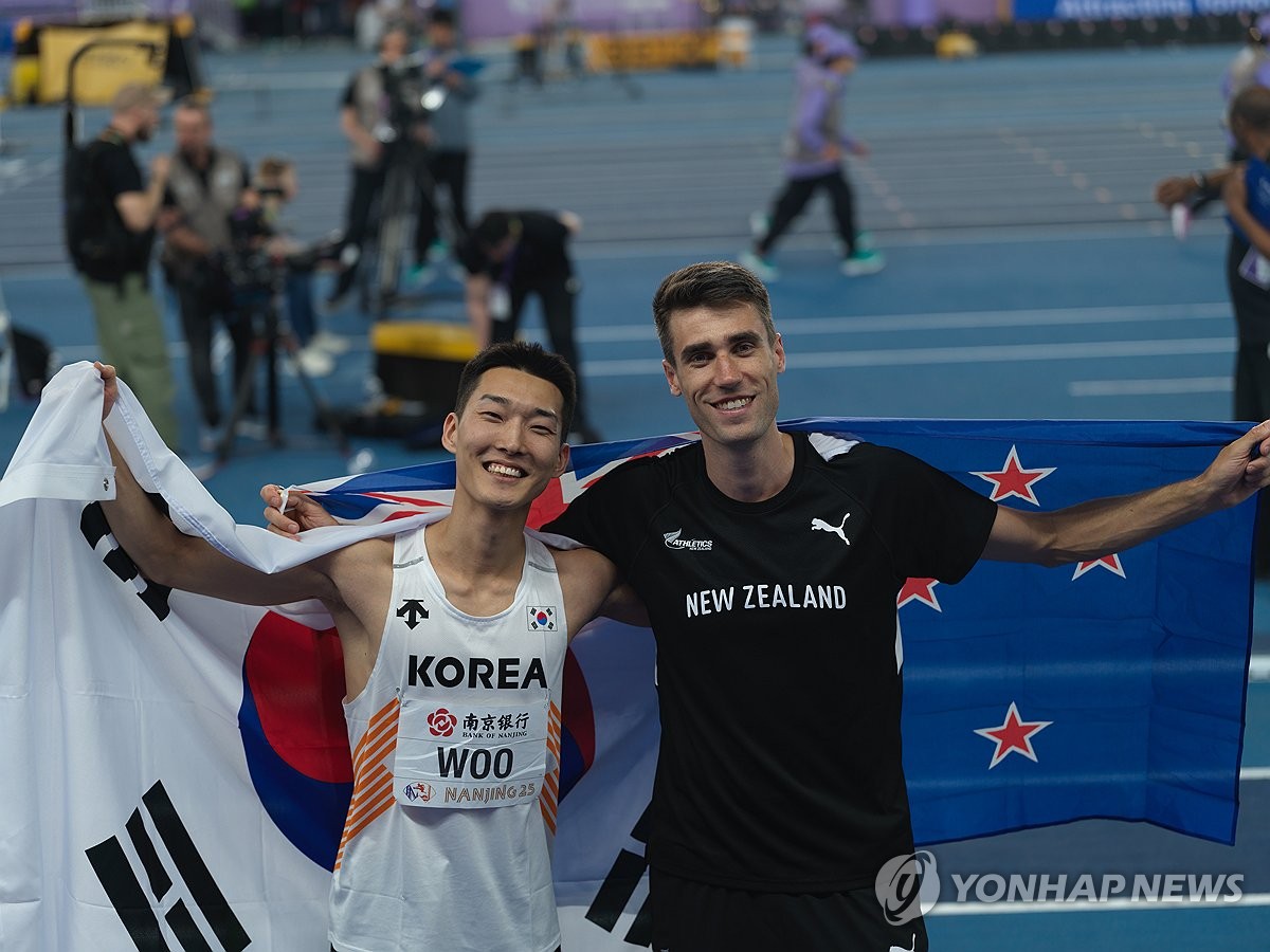 (서울=연합뉴스) 우상혁(왼쪽)이 21일 중국 난징에서 열린 2025 세계실내육상선수권대회 남자 높이뛰기 결선에서 우승한 뒤, 2위 해미시 커와 기념촬영하고 있다. 2025.3.21 [용인시청 육상팀 제공. 재판매 및 DB 금지] photo@yna.co.kr