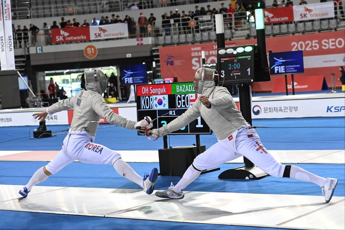 오상욱은 4일 서울 송파구 올림픽공원 펜싱경기장(SK핸드볼경기장)에서 열린 SKT 사브르 그랑프리 남자부 8강전에서 산드로 바자제(조지아)에게 11-15로 패하며 입상이 불발됐다.
