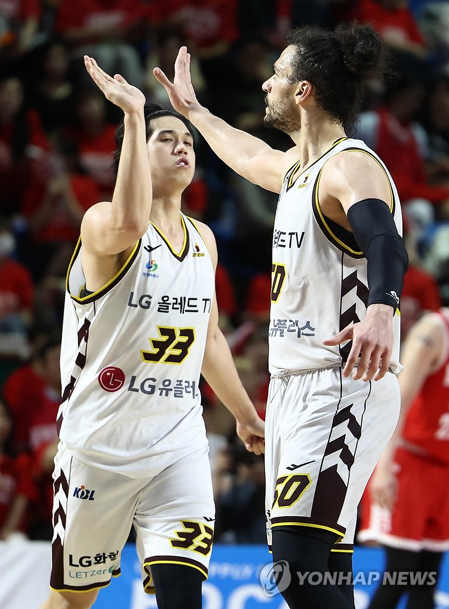 (서울=연합뉴스) 윤동진 기자 = 5일 잠실학생체육관에서 열린 2024-2025 KBL 챔피언결정전 창원 LG 대 서울 SK 경기. LG 마레이가 슛을 성공시킨 후 기뻐하고 있다. 2025.5.5 mon@yna.co.kr