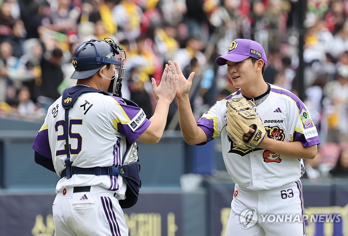 (서울=연합뉴스) 임화영 기자 = 5일 서울 잠실야구장에서 열린 프로야구 LG 트윈스와 두산 베어스의 경기에서 5-2로 승리한 두산 양의지와 김택연이 하이파이브하고 있다. 2025.5.5 hwayoung7@yna.co.kr