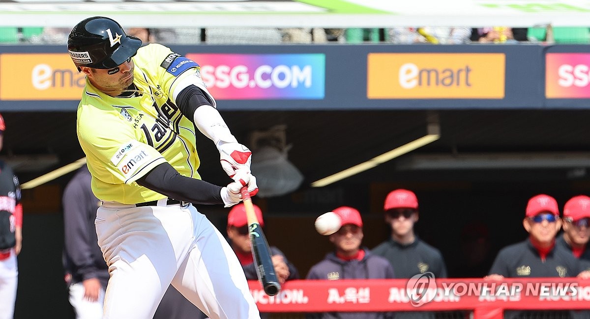 (인천=연합뉴스) 임순석 기자 = 11일 인천 SSG랜더스필드에서 열린 프로야구 2025 신한 SOL 뱅크 KBO리그 KIA 타이거즈와 SSG 랜더스의 더블헤더 1차전. 3회 말 2사 2루 맥브룸이 1타점 2루타를 치고 있다. 2025.5.11 soonseok02@yna.co.kr
