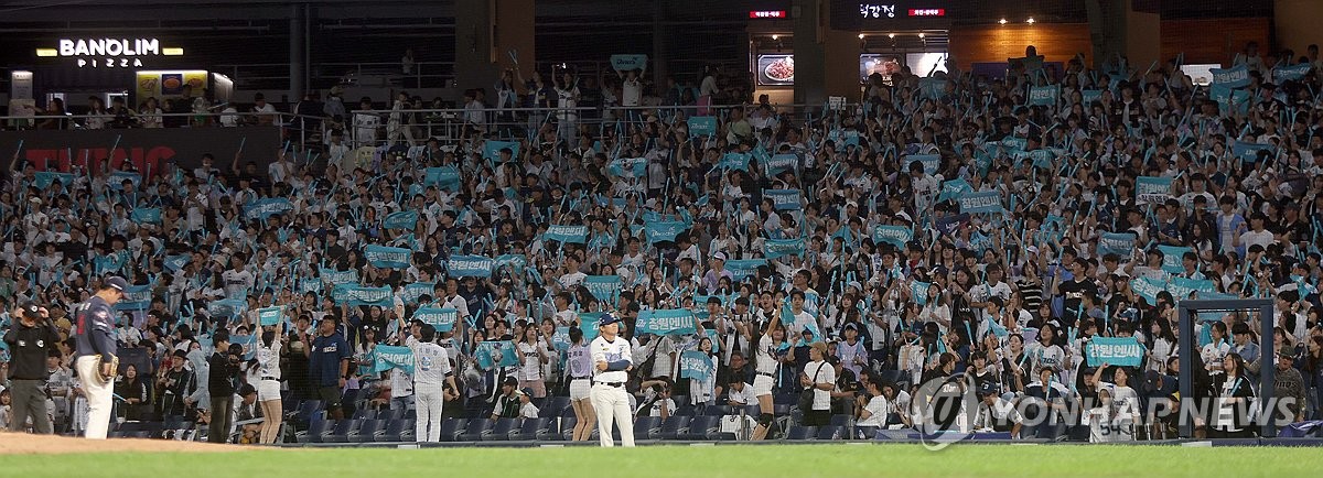 (창원=연합뉴스) 김동민 기자 = 1일 경남 창원NC파크에서 열린 2024 KBO 리그 롯데 자이언츠 대 NC 다이노스 경기. 1루에서 NC팬이 응원가를 부르며 경기를 즐기고 있다. 2024.10.1 image@yna.co.kr