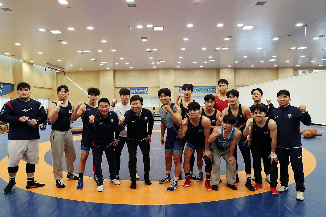 (서울=연합뉴스) 제42대 대한체육회장에 선출된 유승민 당선인(앞줄 중앙)이 14일 진천국가대표선수촌을 찾아 레슬링 선수들을 격려한 뒤 함께 기념 촬영을 하고 있다.