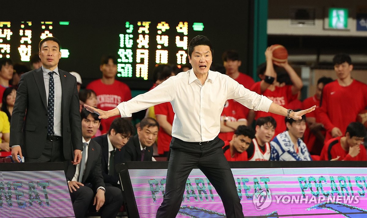 (창원=연합뉴스) 김동민 기자 = 15일 경남 창원체육관에서 열린 2024∼2025시즌 프로농구 창원 LG 세이커스와 서울 SK 나이츠의 챔피언결정전 6차전 경기. SK 전희철 감독이 2쿼터에 작전 지시를 내리고 있다. 2025.5.15 image@yna.co.kr