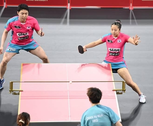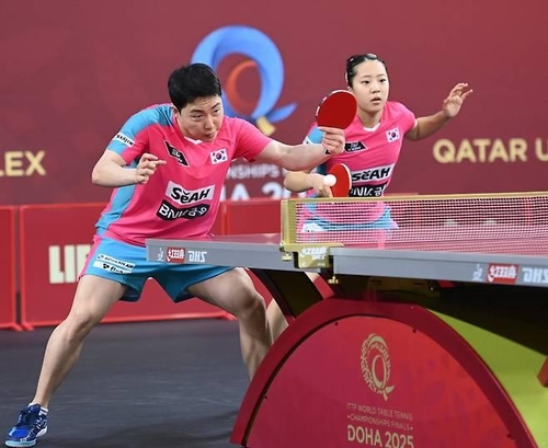 신유빈은 19일 카타르 도하의 스포츠아레나에서 열린 대회 혼합복식 32강에서 임종훈(한국거래소)과 손발을 맞춰 나이지리아의 올라지데오모타요-카비랏 아욜라 조를 3-0(11-2 11-3 11-4)으로 완파하고 16강에 올랐다.